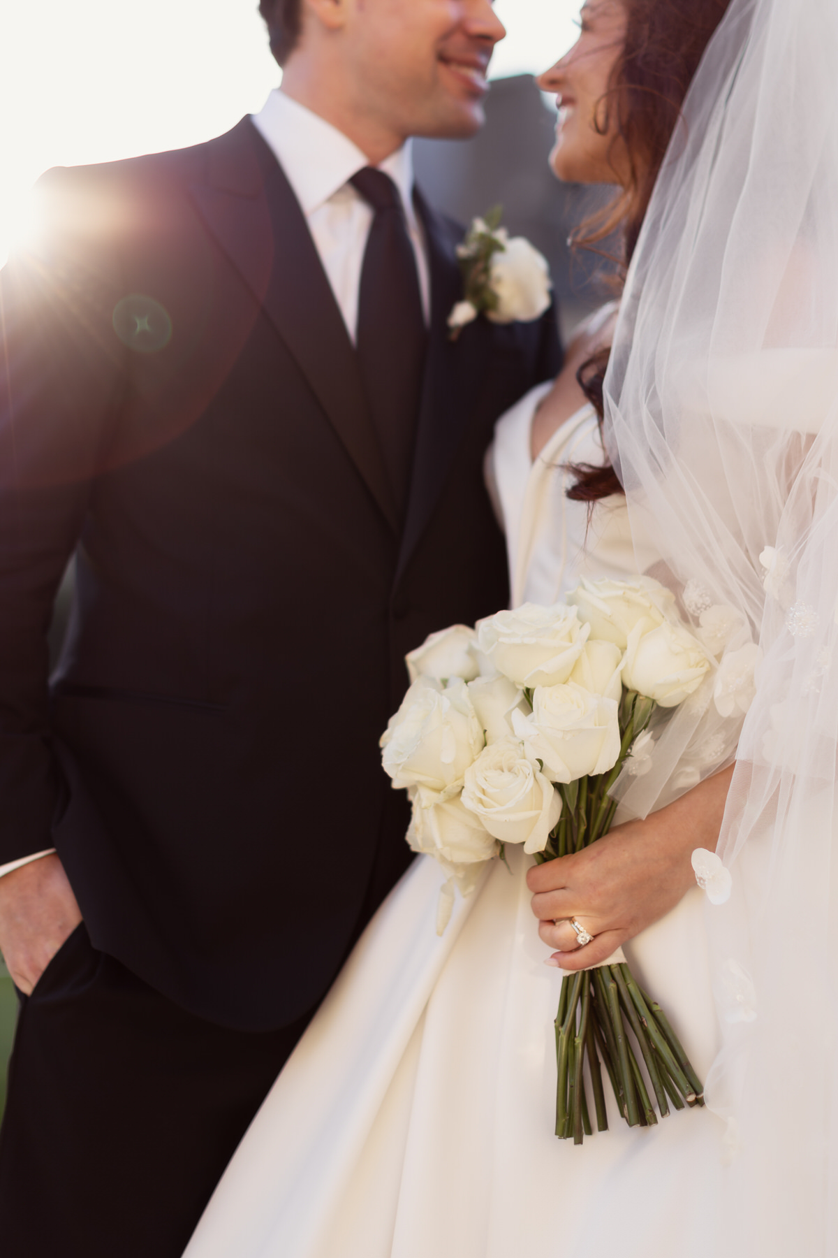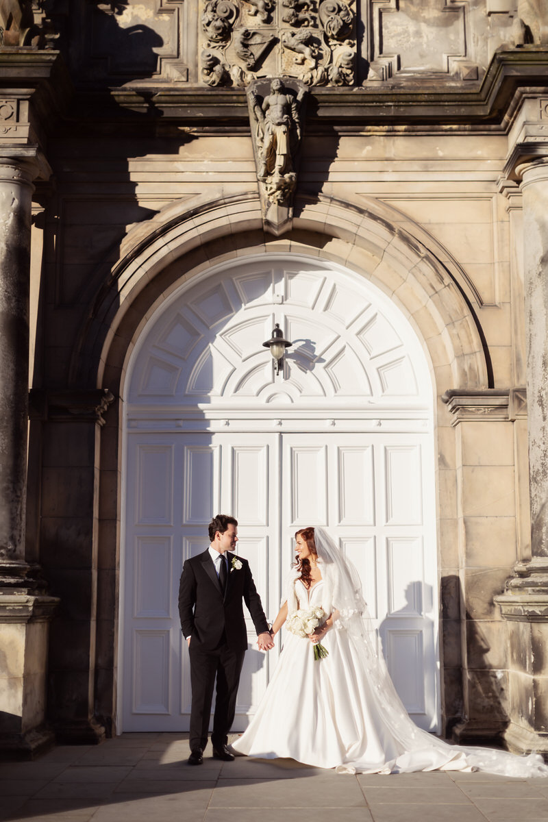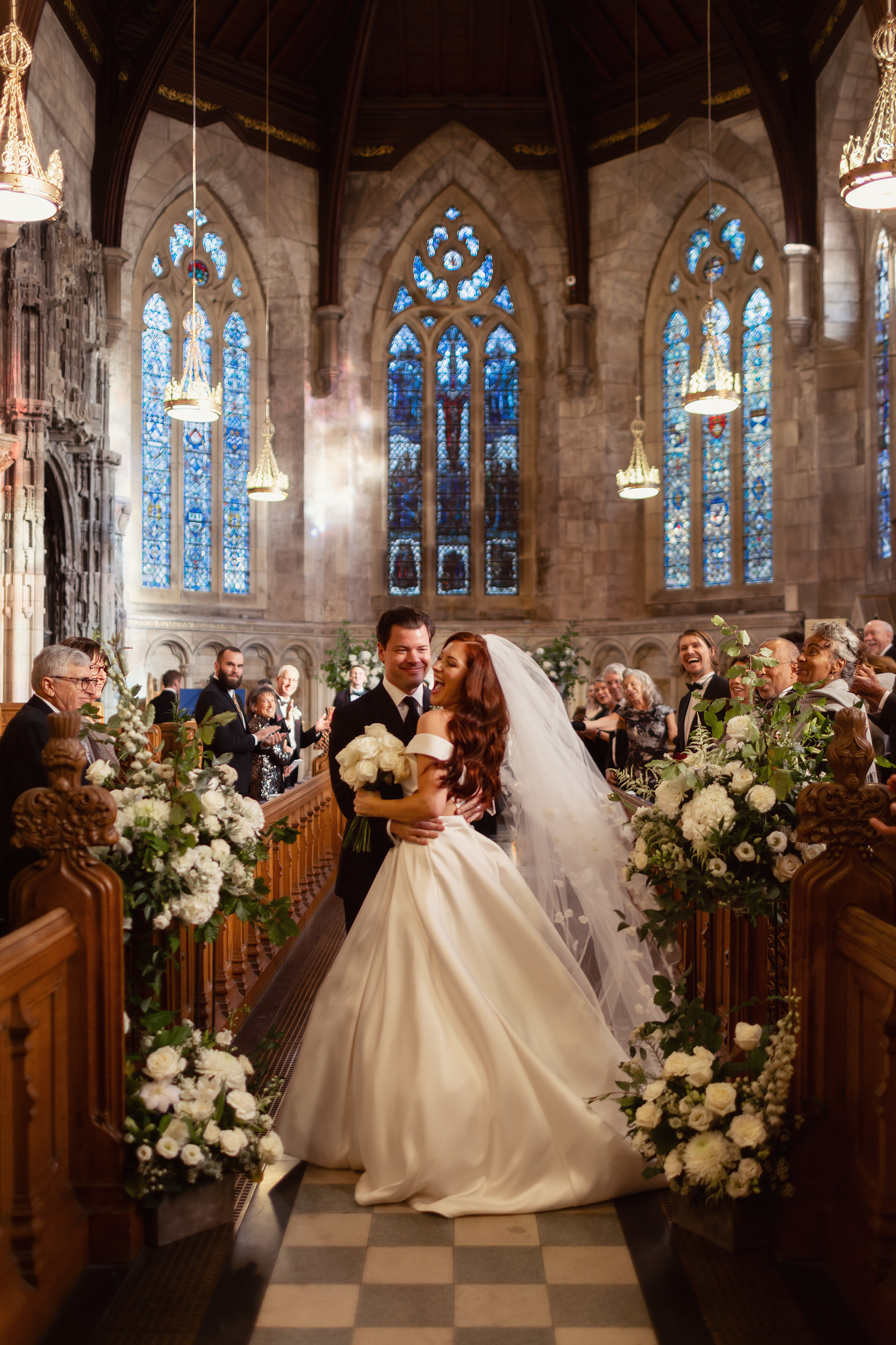 The ceremony took place in the historic St Salvator’s Chapel in the centre of St Andrews. We were on hand to add details to the chapel, framing the couple with beautiful florals in white and ivory tones, offset by hints of soft green foliage. Caroline’s elegant bouquet of soft ivory roses told a story of love and romance, beautifully complementing her dress. Together, they were the most dashing of couples.