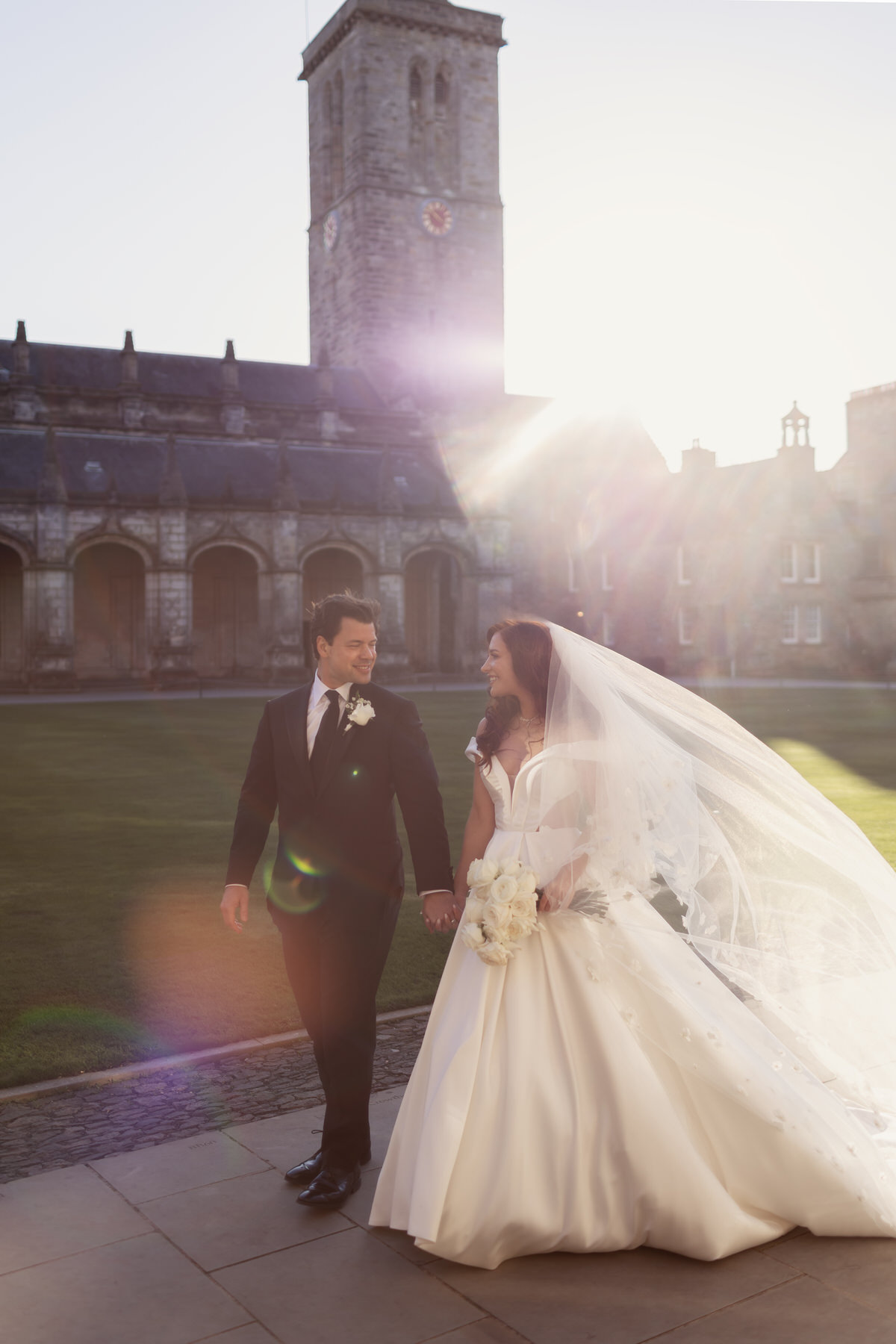 The ceremony took place in the historic St Salvator’s Chapel in the centre of St Andrews. We were on hand to add details to the chapel, framing the couple with beautiful florals in white and ivory tones, offset by hints of soft green foliage. Caroline’s elegant bouquet of soft ivory roses told a story of love and romance, beautifully complementing her dress. Together, they were the most dashing of couples.