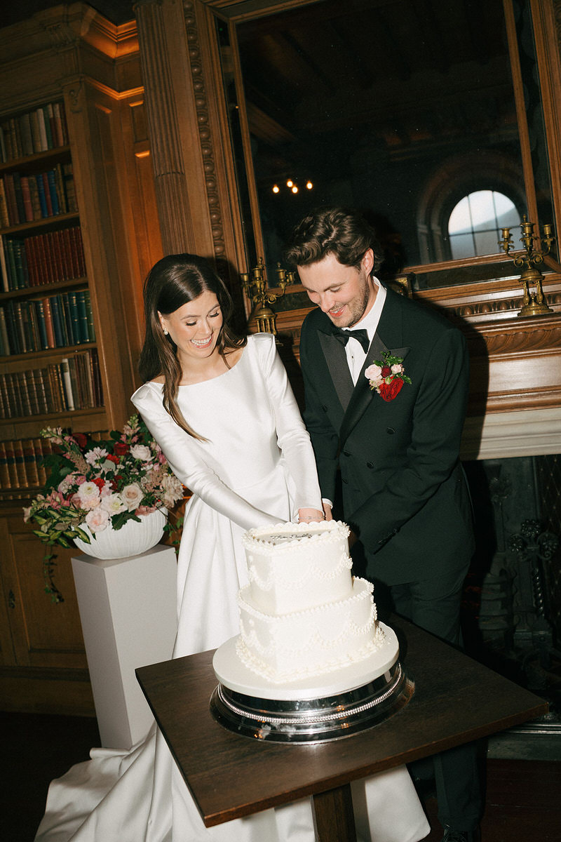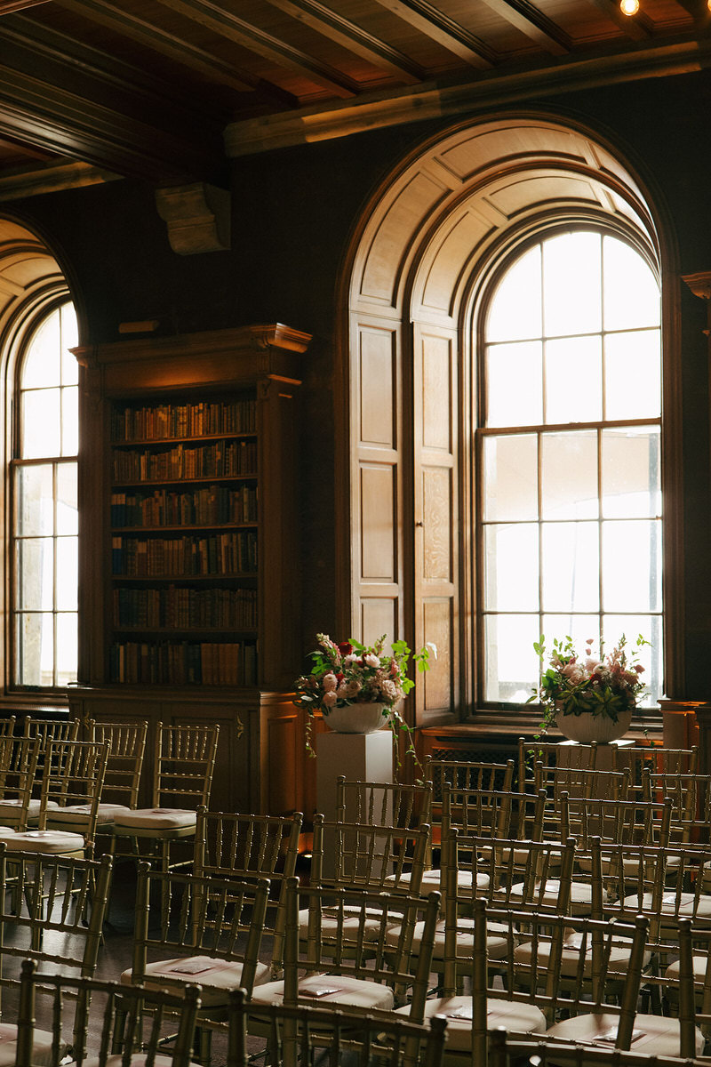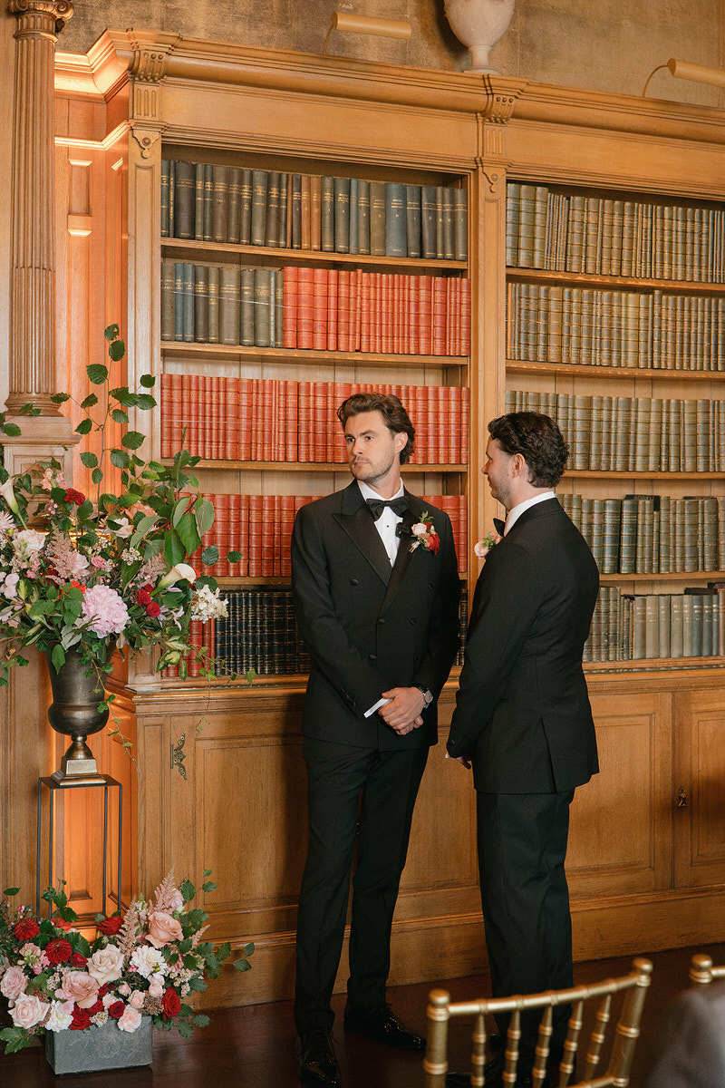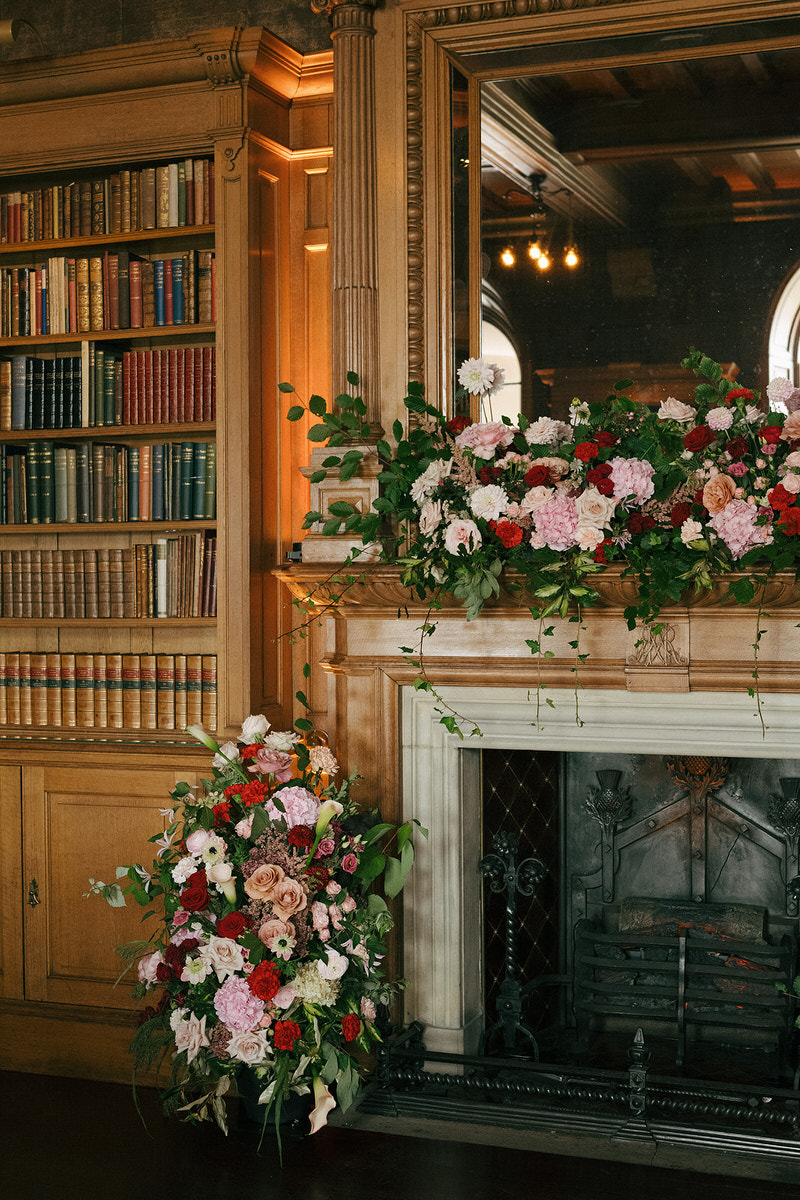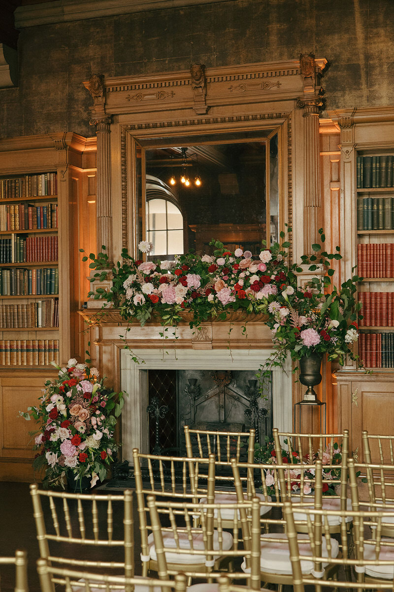 Nicole and Ryan exchanged vows before a grand fireplace in the venue’s Scottish library, surrounded by thousands of books. Cascading florals adorned the mantle, while abundant bowls graced plinths at the back of the aisle, inviting guests to immerse themselves in the dramatic setting.