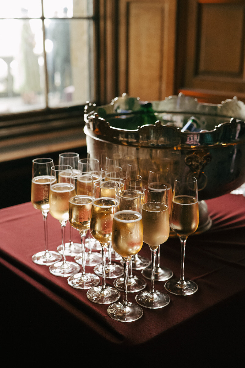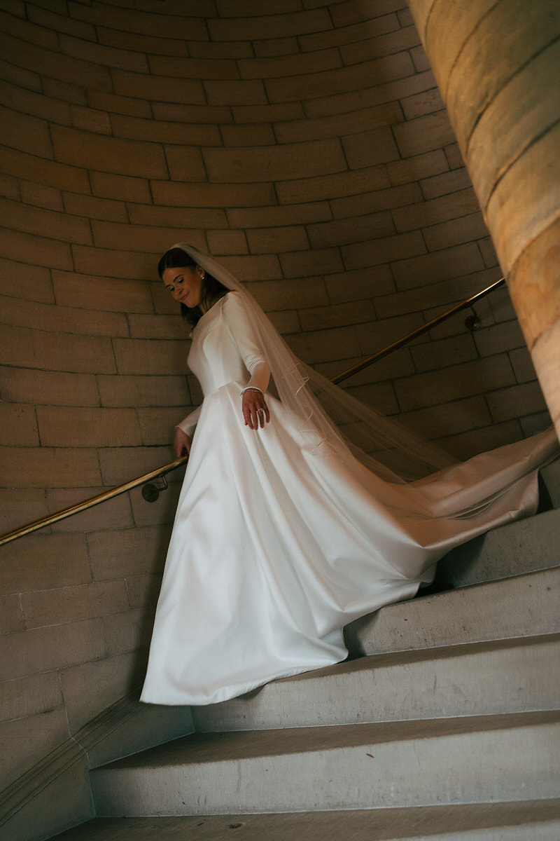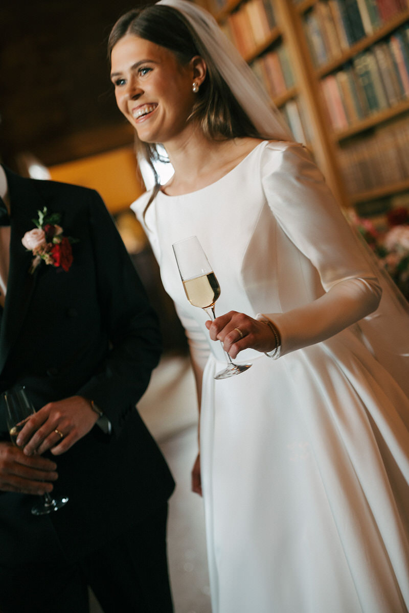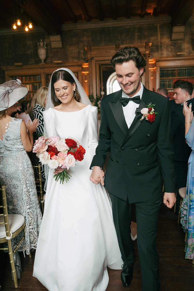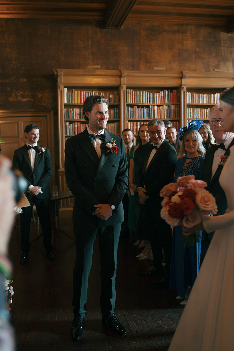Nicole and Ryan exchanged vows before a grand fireplace in the venue’s Scottish library, surrounded by thousands of books. Cascading florals adorned the mantle, while abundant bowls graced plinths at the back of the aisle, inviting guests to immerse themselves in the dramatic setting.