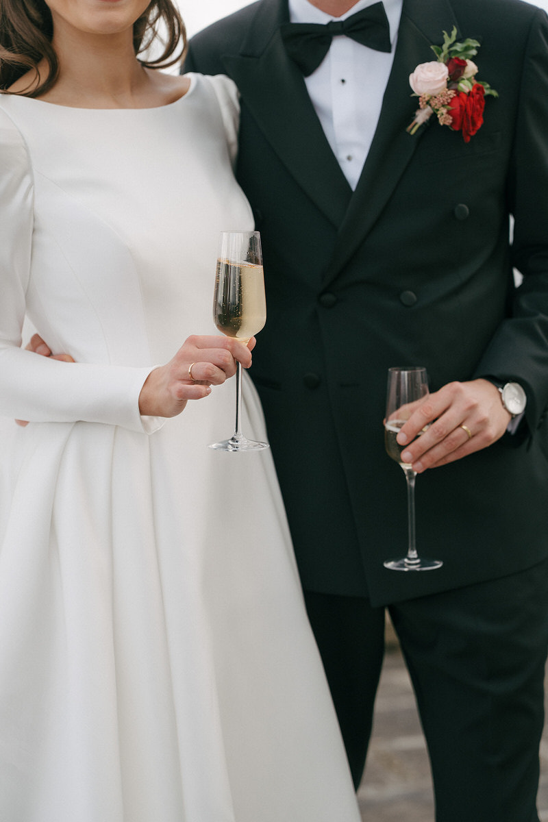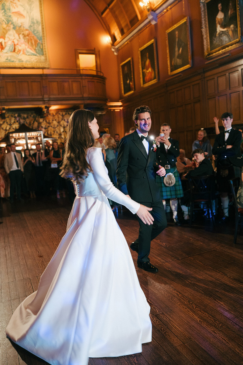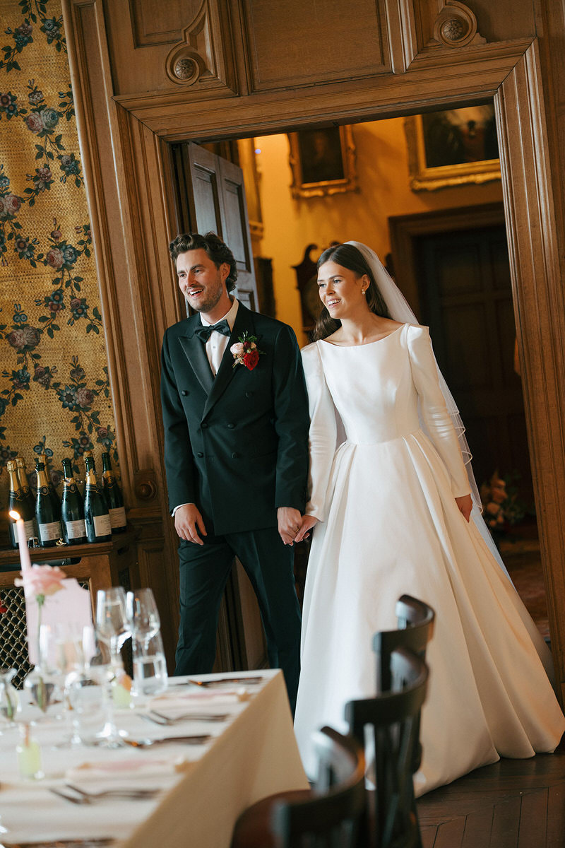 Nestled on the outskirts of Edinburgh, Barnbougle Castle served as the perfect backdrop for Nicole and Ryan’s romantic castle wedding with modern fairytale vibes. Dramatically perched on the shoreline, the castle offers an ideal vantage point to experience the ever-changing moods of the Scottish weather, adding a mystical drama to the day.
