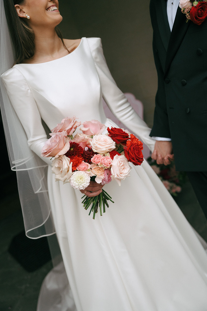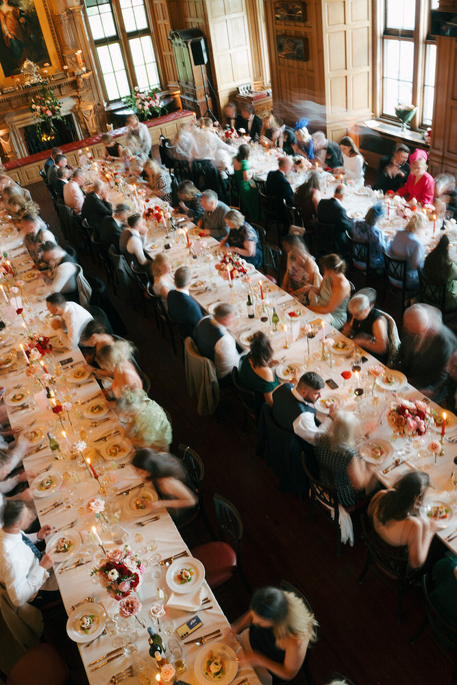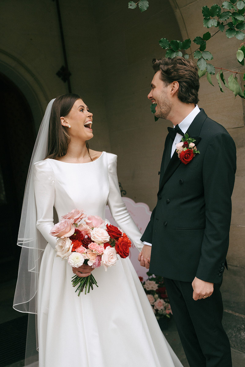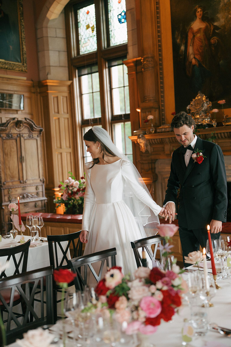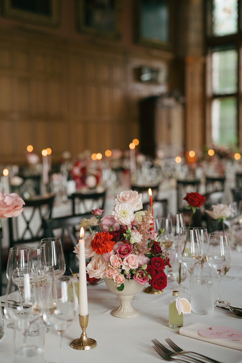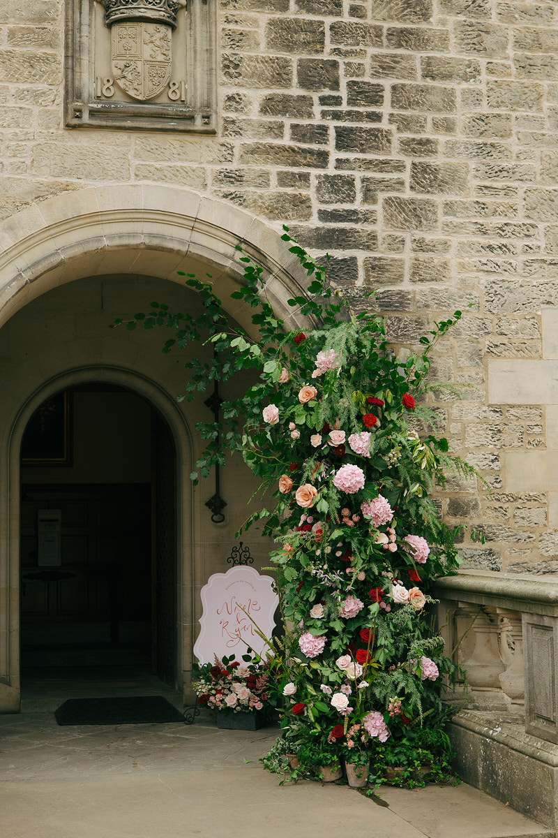 The couple embraced a vibrant colour clashing palette, bursting with rich reds and delicate pinks, which enhanced the castle’s timeless features. As guests arrived, they were welcomed by a whimsy floral column that softened the castle’s historic stone facade.