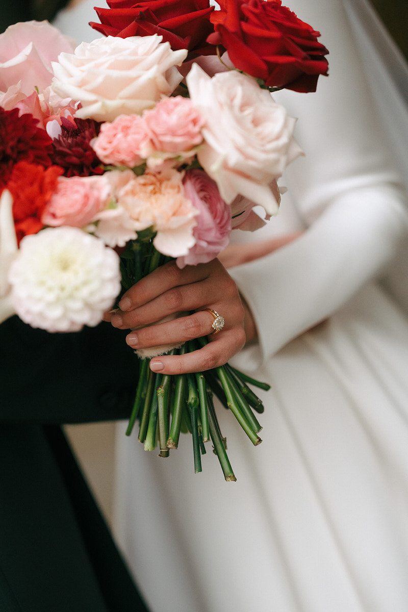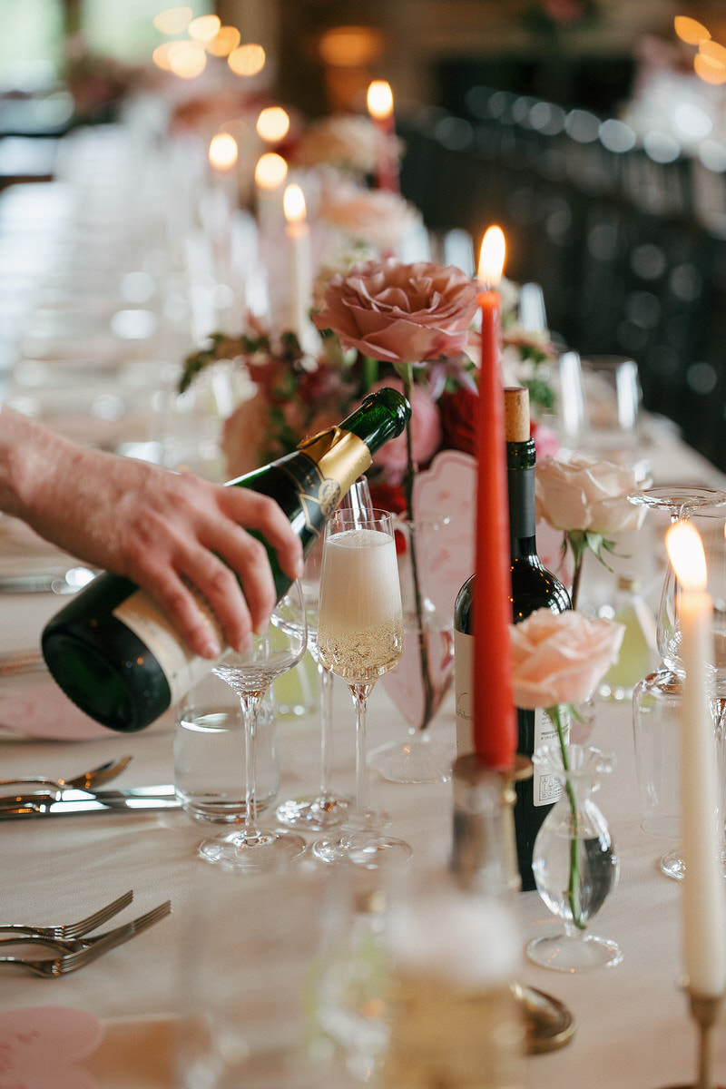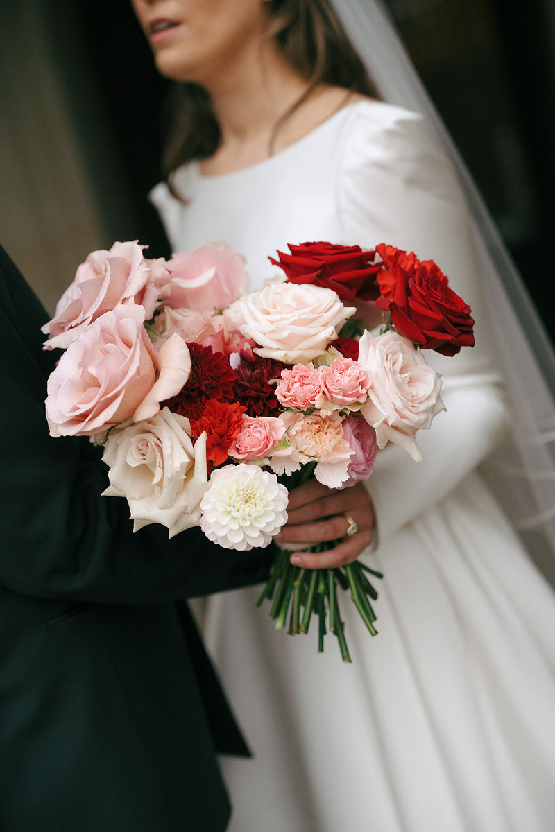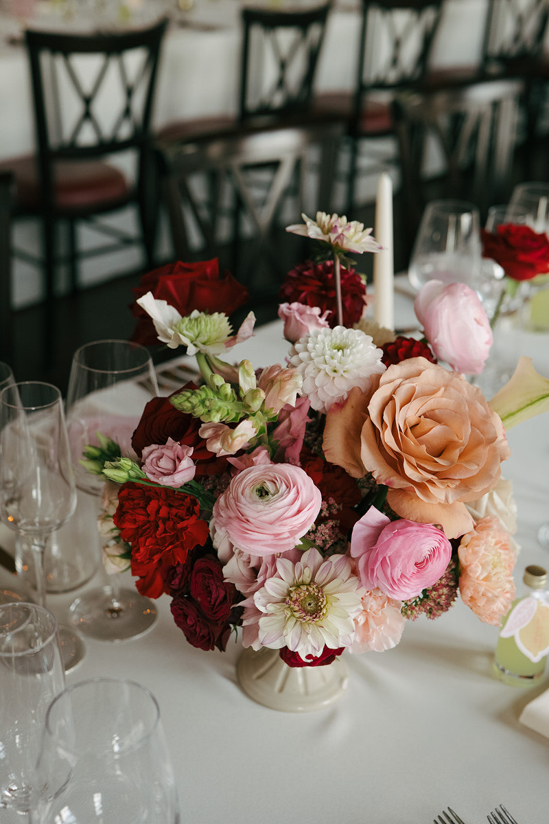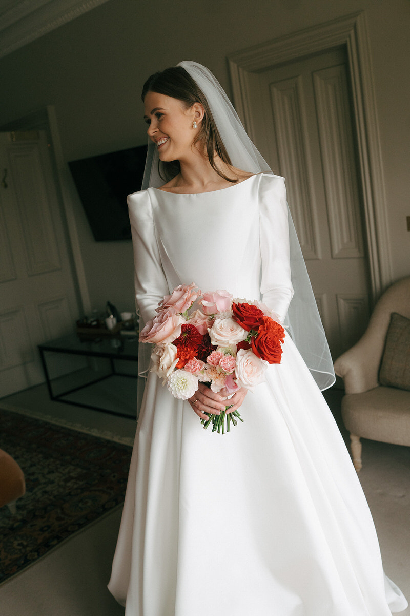 The couple embraced a vibrant colour clashing palette, bursting with rich reds and delicate pinks, which enhanced the castle’s timeless features. As guests arrived, they were welcomed by a whimsy floral column that softened the castle’s historic stone facade.