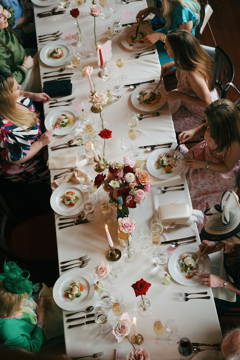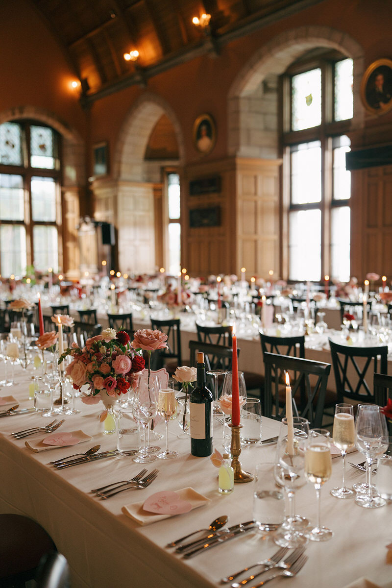 Later, the festivities continued in the Barrel-vaulted Banqueting Hall. The tables featured overflowing bowls of florals, delicate single-stem vases, and softly glowing tonal taper candles in vintage brass holders, creating an ambiance of elegance and warmth.