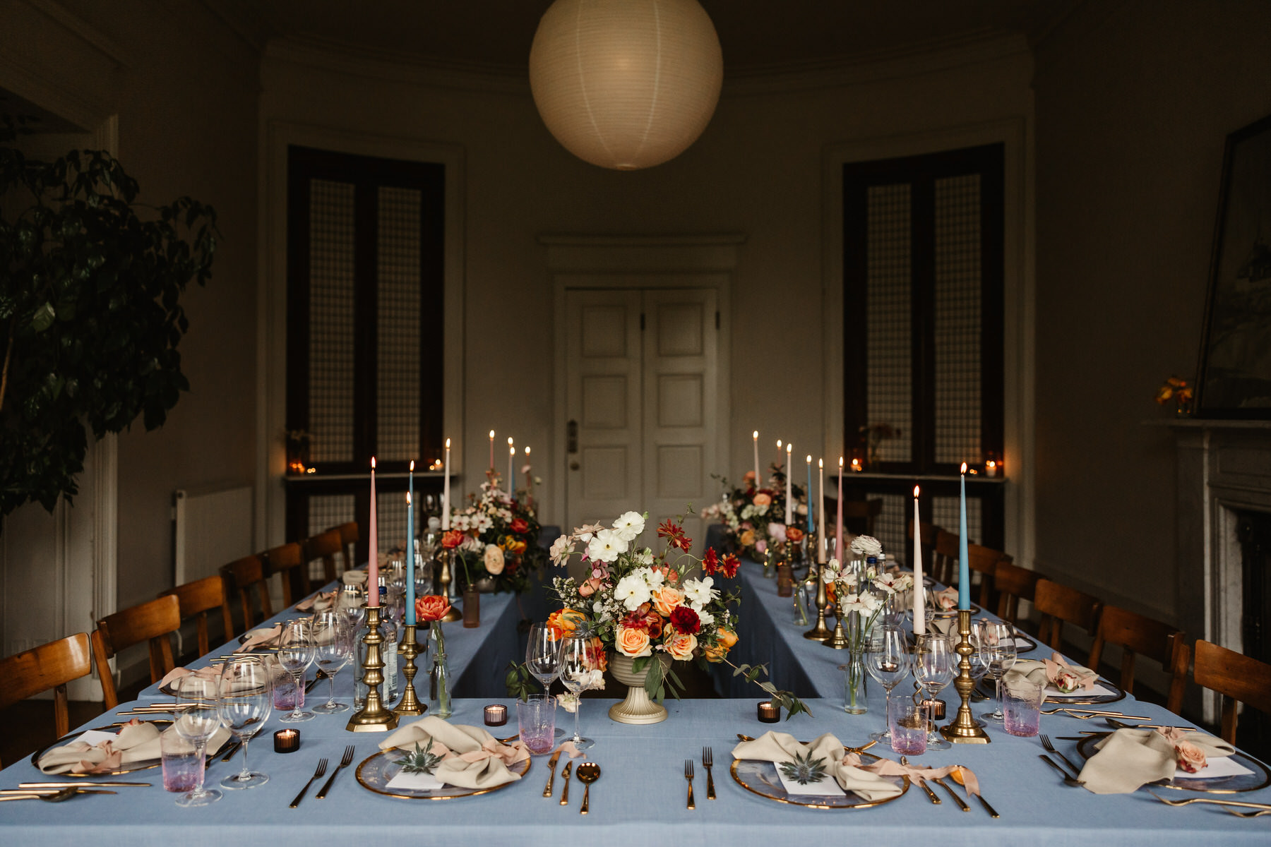 For their dinner reception, Sam and Ron chose the breathtaking Boath House, known for its palatial yet intimate and romantic atmosphere. Guests were welcomed with a glass of fizz as they entered, then floated into the candlelit living room. The room was adorned with seasonal blooms displayed in a mix of brass, blue ceramic, and pink etched glass bottle vases, perfectly showcasing the pops of moody and earthy tones from their colour palette.
